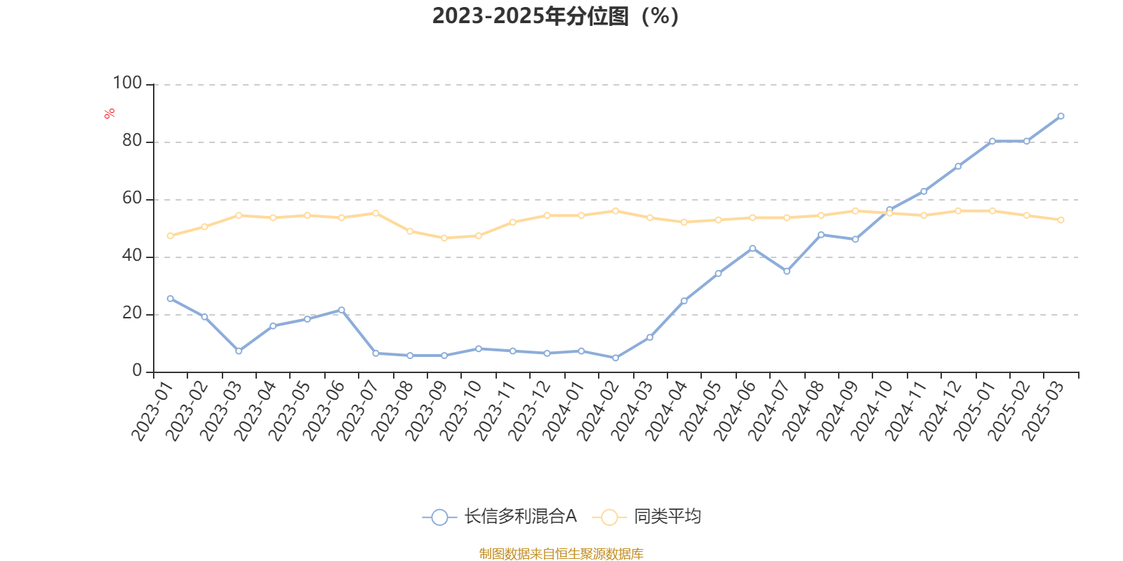 通过所选区间该基金净值增长率分位图,可以观察该基金与同类基金业绩比较情况。图为坐标原点到区间内某时点的净值增长率在同类基金中的分位数。